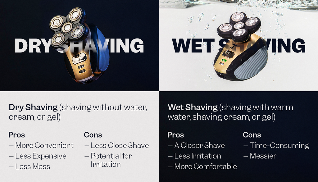 Wet shaving gives a closer, more comfortable shave, but takes more time. Dry shaving is quick, less messy. Great for busy mornings, but it can irritate sensitive skin.
